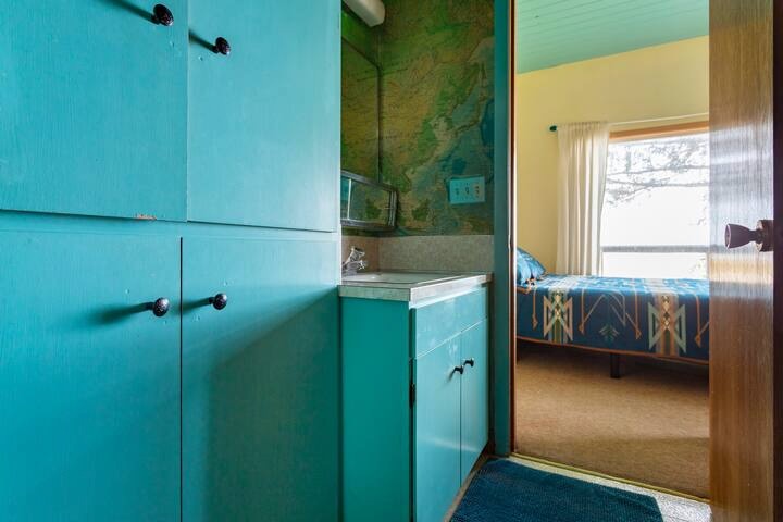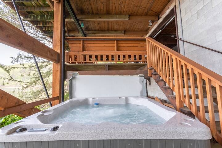 Our cabin is small but well appointed for 8 guests. Each side features 2 bedrooms with jack-and-jill bathrooms. The great room opens to amazing views and a wrap-around deck. The lower deck is sheltered, and provides space to barbecue and access to our hot tub, complete with outdoor shower.